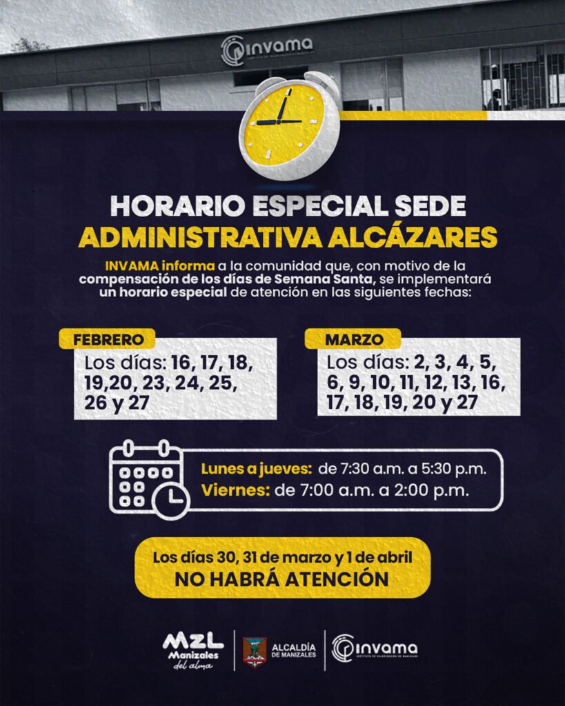 INVAMA informa a la comunidad que, con motivo de la compensación de los días de Semana Santa, se implementará un horario especial de atención durante algunas fechas de febrero y marzo.