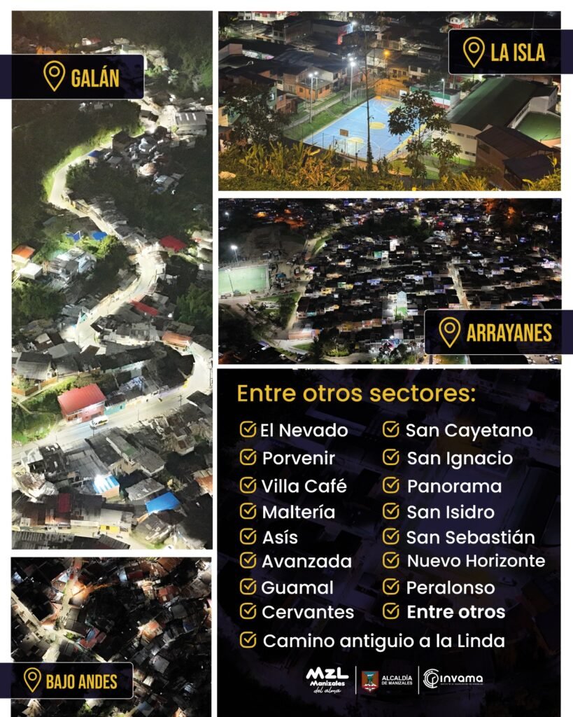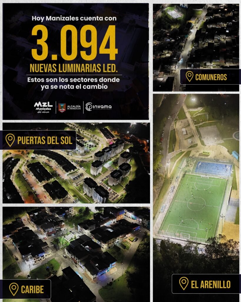 Hoy 3.094 nuevas luminarias LED alumbran las calles y transforman nuestros barrios. Desde Puertas del Sol hasta Panorama, pasando por Comuneros, Caribe, La Isla, Arrayanes, El Nevado y muchos sectores más ¡la luz del progreso ya está encendida! INVAMA sigue haciendo de Manizales un lugar más seguro y sostenible